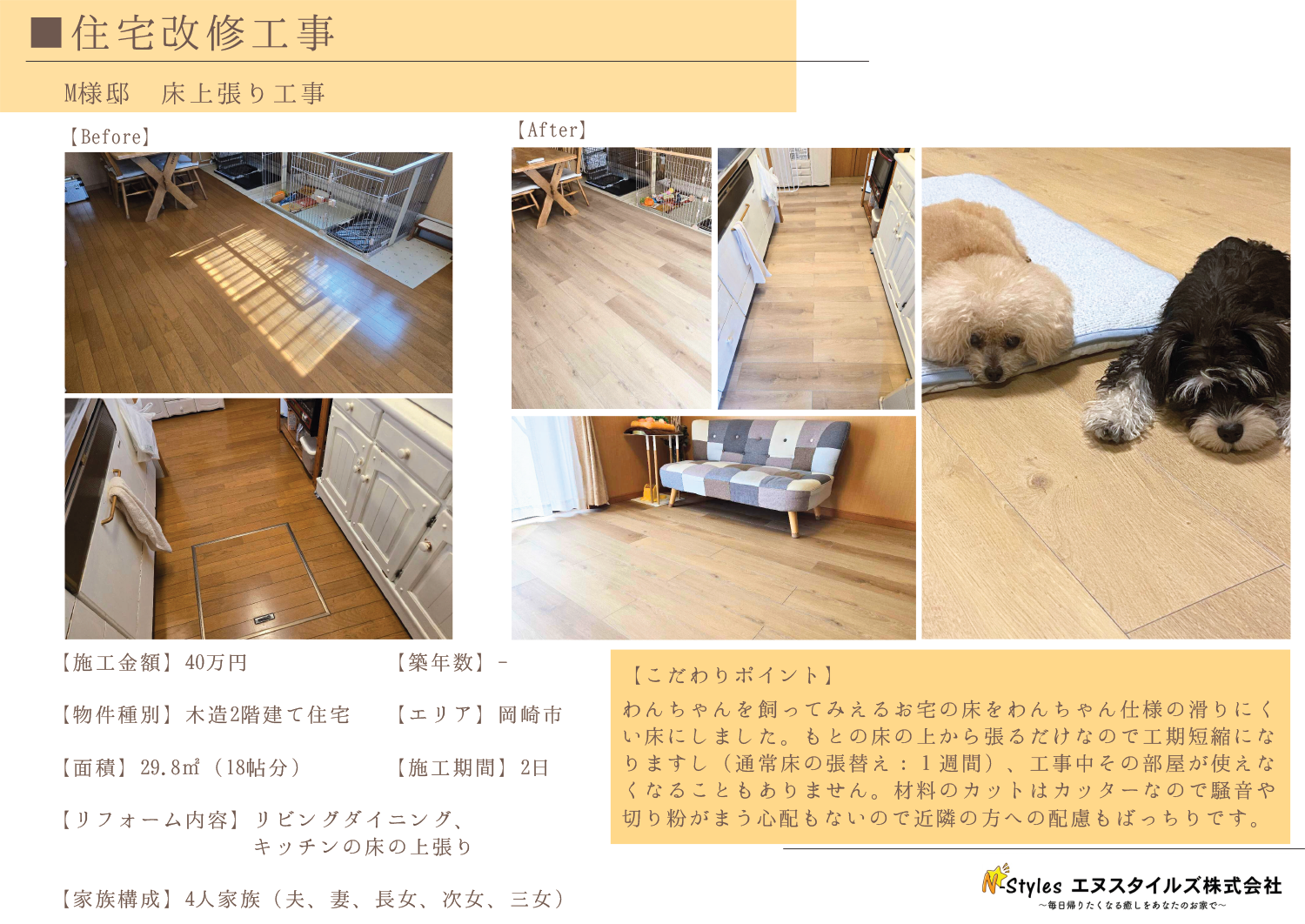 わんちゃんを飼ってみえるお宅の床をわんちゃん仕様の滑りにくい床にしました。もとの床の上から張るだけなので工期短縮になりますし(通常床の張替え:1週間)、工事中その部屋が使えなくなることもありません。材料のカットはカッターなので騒音や切り粉がまう心配もないので近隣の方への配慮もばっちりです。